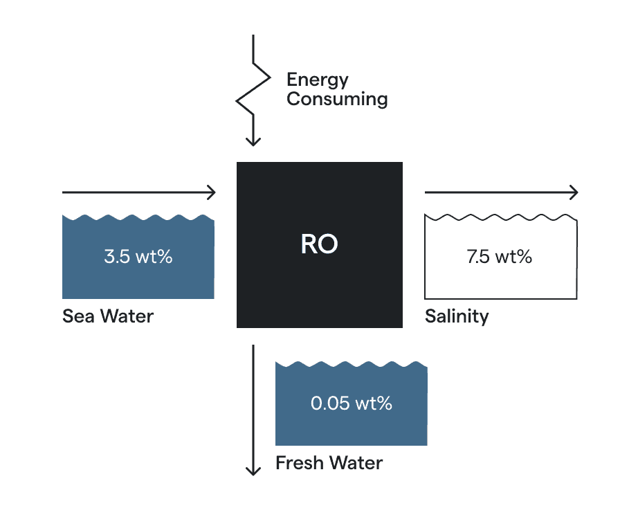 The desalination process removes brine water, ensuring the discharged water retains the natural salinity of seawater without mixing.