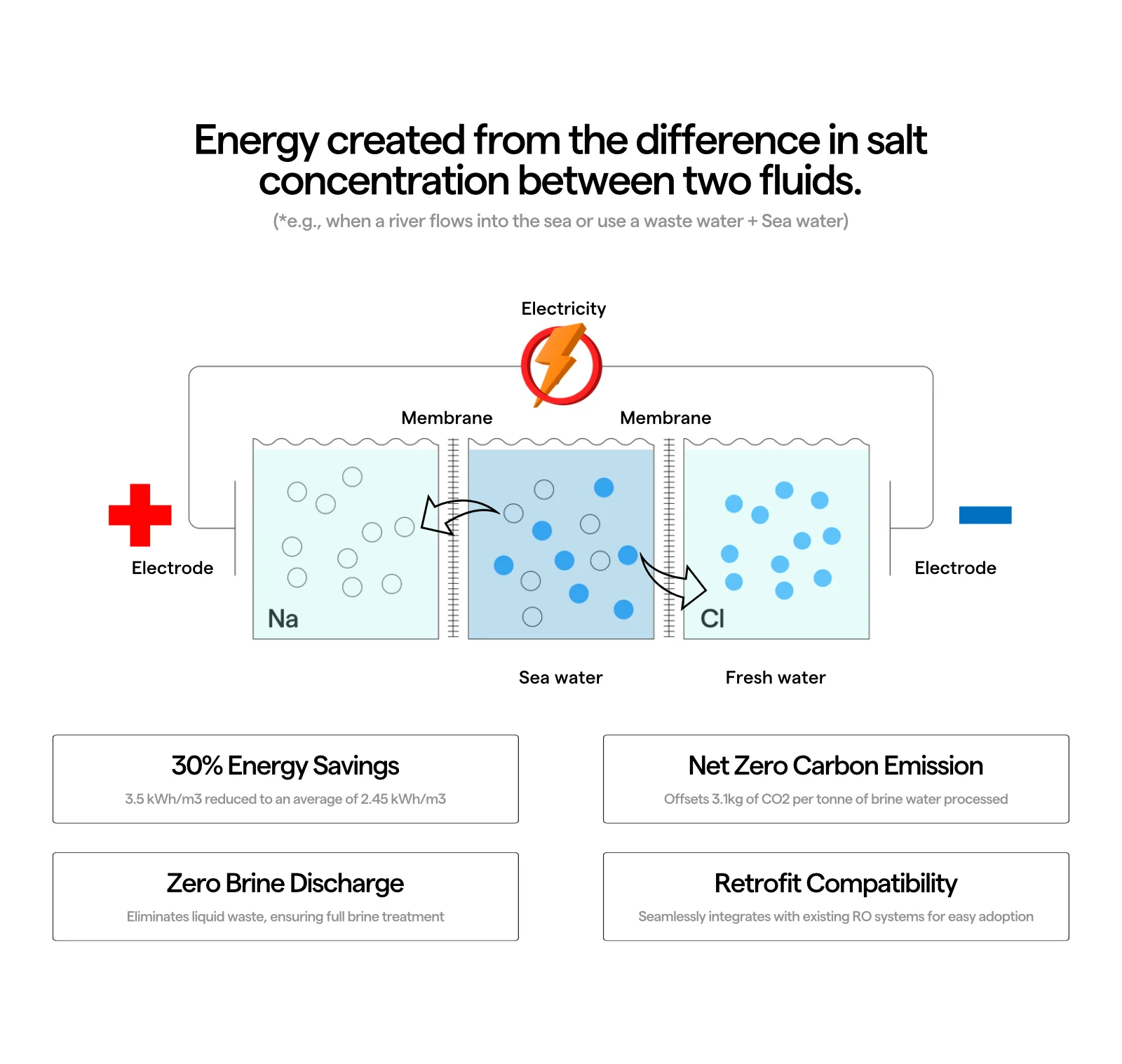 Our proprietary Reverse Electrodialysis (R.E.D.) technology generates electricity from saltwater. This process reduces the Specific Energy Consumption (SEC) of R/O desalination plants by up to 30%, making water affordable and operations more sustainable.